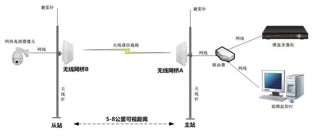 室外型无线AP网桥采用室外防水设计,具有工作稳定,传输速率高,接收灵敏度高,覆盖距离远,适应各类环境等特点,适用于连锁企业、酒店宾馆、商业、银行、医疗、景区、学校等室外场所。点对点无线组网结构示意图如下: