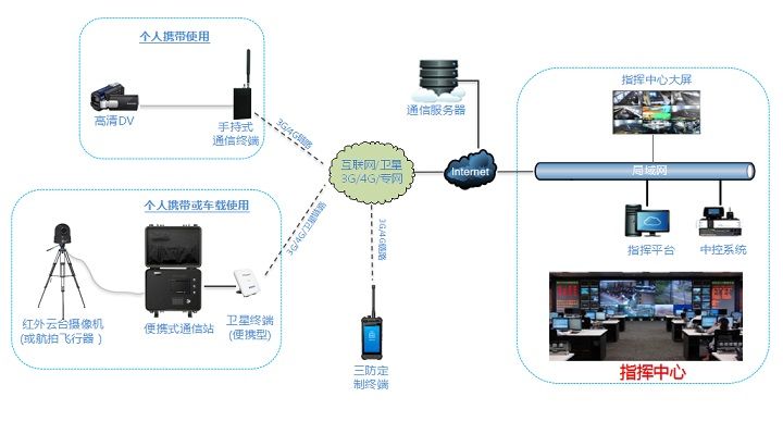 该系统针对目前应急指挥调度过程中存在实际需求和现有系统不足,并本着设备小型化,功能实用性、使用简便化、展开快速化等设计理念研发。系统集成国际领先的音视频编解码处理技术及3G/4G无线通信、窄带卫星网络通信等技术,更能够贴近应急指挥行业的实际需要,满足常规条件及特殊环境的正常使用,可通过个人携带及车辆部署的方式实现应“静中通”和“动中通”,保证指挥调度工作全程不间断,为指挥部门应对各种突发事件、应急演练、综合调度等提供有力的指挥手段和通信工具。
