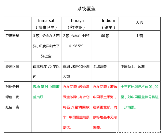 卫星移动通信系统的中国用户主要来自行业需求,主要包括五个大方向:应急通信、海上通信、野外作业、旅游探险和物联网。 基于以上的行业需求,评价卫星移动通信系统好和坏主要包括四个维度:系 统覆盖、系统安全可控、系统通信可靠性和易用性、系统使用成本。 按照这四个维度分析,中国天通卫星电话系统具有明显的优势,具体分析如下: