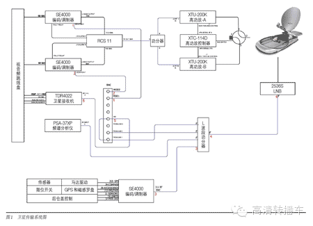 如图1所示,卫星传输系统分为上行系统和下行系统两部分,主要由车载天线系统、高功放、上变频器、编码调制器、LNB (低噪声下变频器)、IRD (解码器)、频谱分析仪、RF跳线排等设备组成。