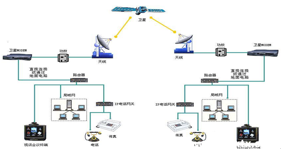 用户一端租用地面专线或者VPN链接到卫星主站,通过卫星主站的卫星通信系统与用户另一端的卫星端站通信。