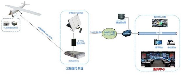 机载发射机通过采集遥控飞机自带摄像头高清视频信号,利用无线载波传输的方式将视频实时传输到地面接收机,接收机将接收到的视频信号传输给手持式通信终端,手持通信终端对视频进行编解码压缩后利用3G/4G/卫星网络链路将视频信号传送到互联网的通信服务器,后方指挥中心采用提供的客户端软件,可以在全球通过互联网登录通信服务器进行信息查看,同时指挥中心也可以通过客户端与地面控制人员进行双向语音交流。